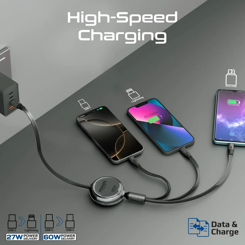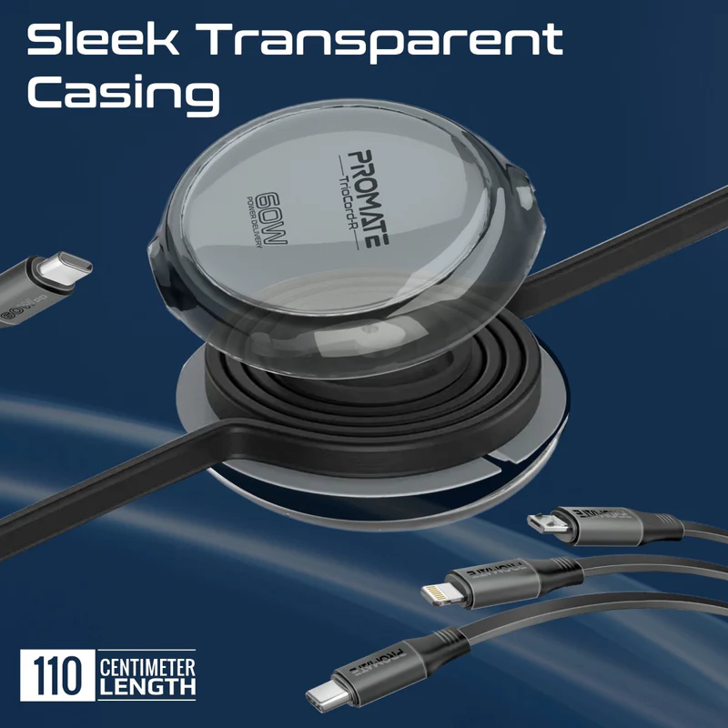 Elevate your charging game with the TrioCord-R by Promate, a versatile 3-in-1 retractable cable designed to keep you powered up with efficiency. Whether you need USB-C to USB-C for rapid sync and charge, USB-C to Lightning for quick charging, or USB-C to Micro-USB compatibility, this cable has you covered. Built with Nickel-plated connectors and crafted from durable materials, TrioCord-R ensures a reliable connection every time. Simplify your tech life with one cable that does it all, offering seamless power for all your devices and data transfer for Type-C devices. Compact, tangle-free, and ready to go wherever you need it—TrioCord-R is the ultimate travel companion for modern tech users.