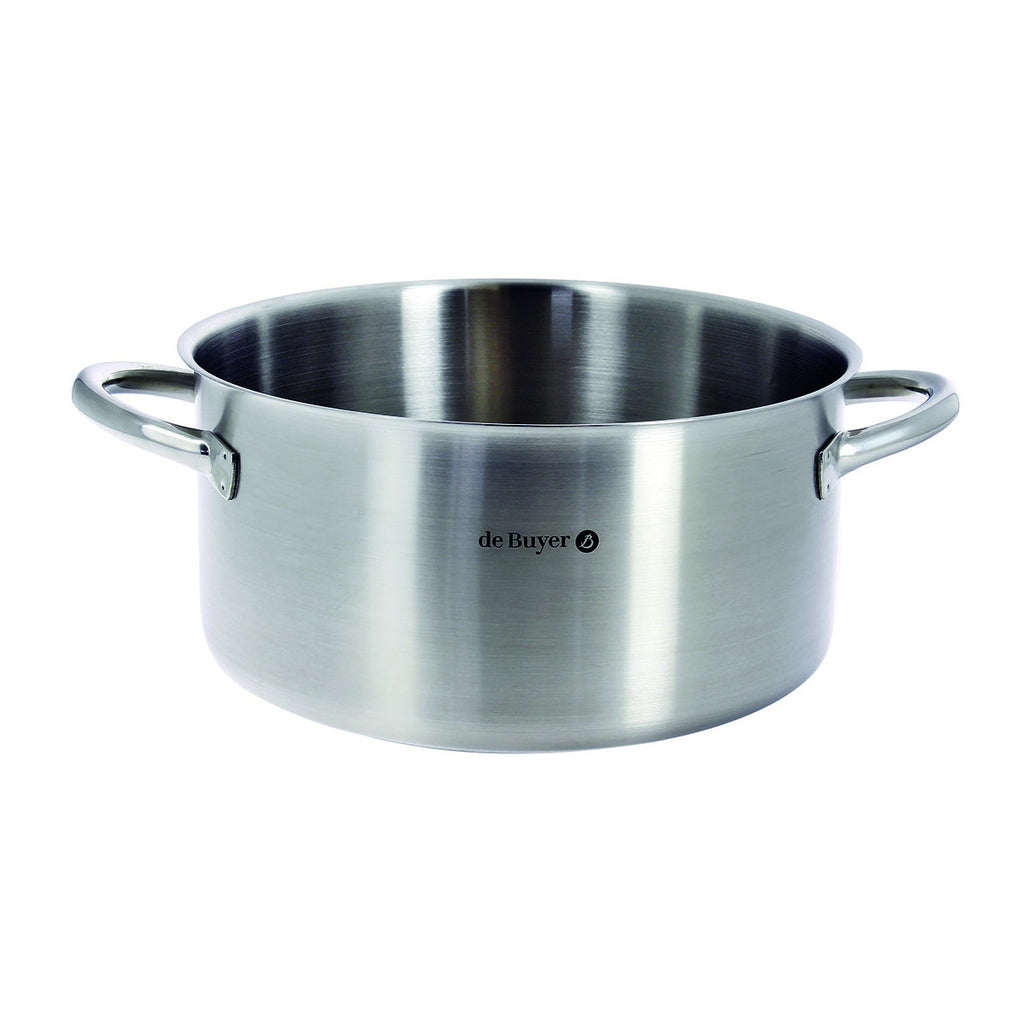 PRIM'APPETY cookware in AISI 304 stainless steel with pouring lips and sandwich bottom, which makes it compatible with induction and enables uniform heat distribution across the bottom of the cookware.
