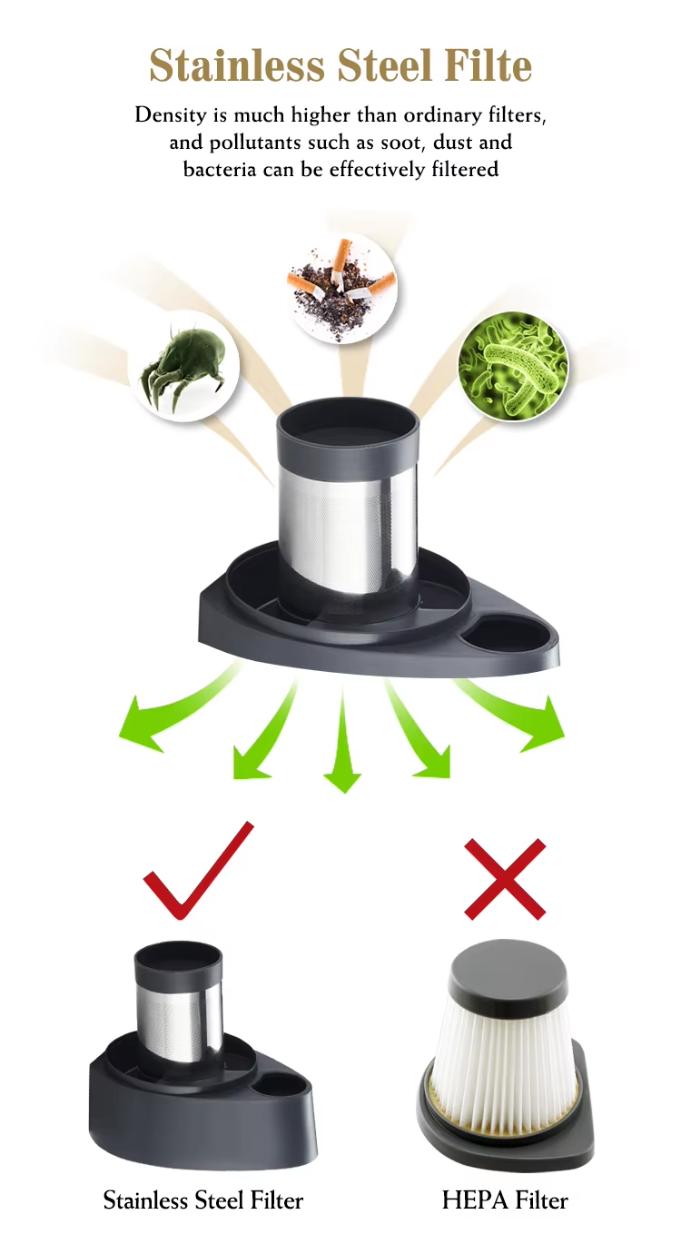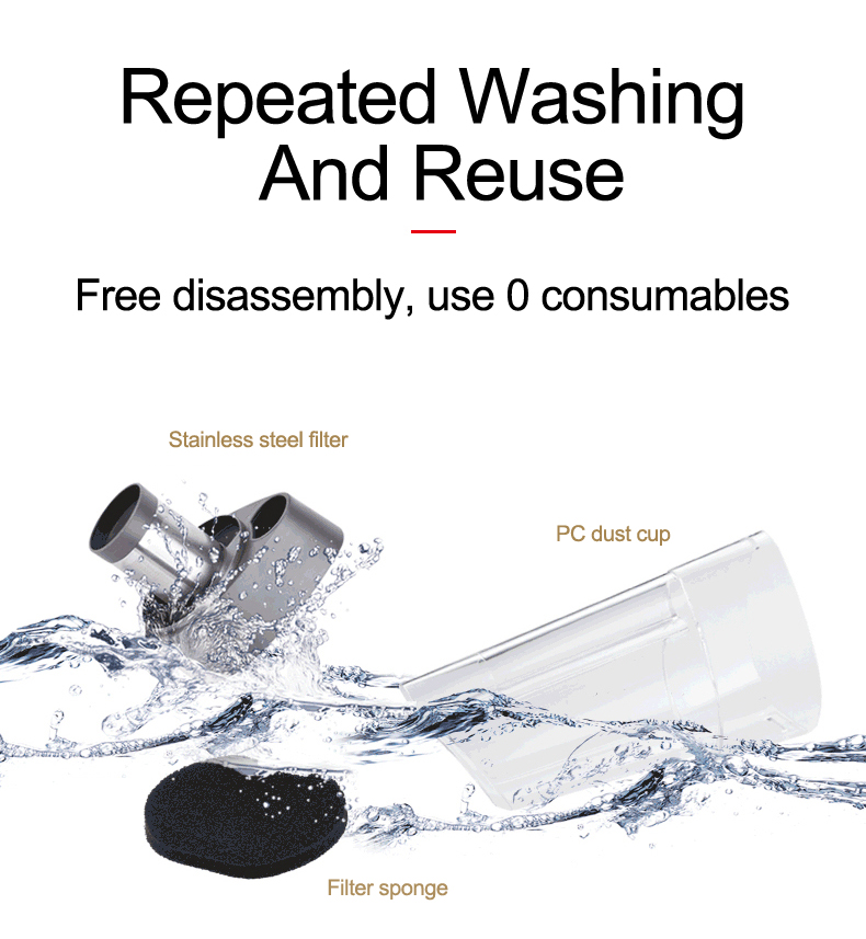 360° cyclonic system upgrade design,12V 120W car vacuum cleaner high power 4000PA large suction, DC 12V car vacuum cleaner can effectively clean the dust inside the car, the dust would not leave on the filter of car dust collector, use high-performance movement, turbine motor vacuuming and reduce noise to below 50db, efficiently avoid the damage of supply power.