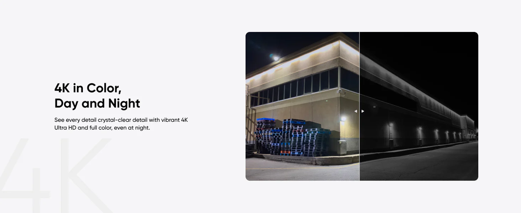 4K in Color, Day and Night:The color 4K camera gives you the clarity to identify a license plate 30 feet (10 meters) away. Shine a light on your surroundings with the 100-lumenspotlight to continue seeing colorful details up to 26 feet (8 meters) away, all through the night.
