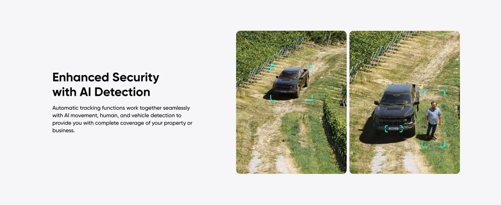 360° Viewing withAI Tracking:All-around viewing with pan and tilt.AIdetects and tracks people, and vehicles, with an extensive range of motion.